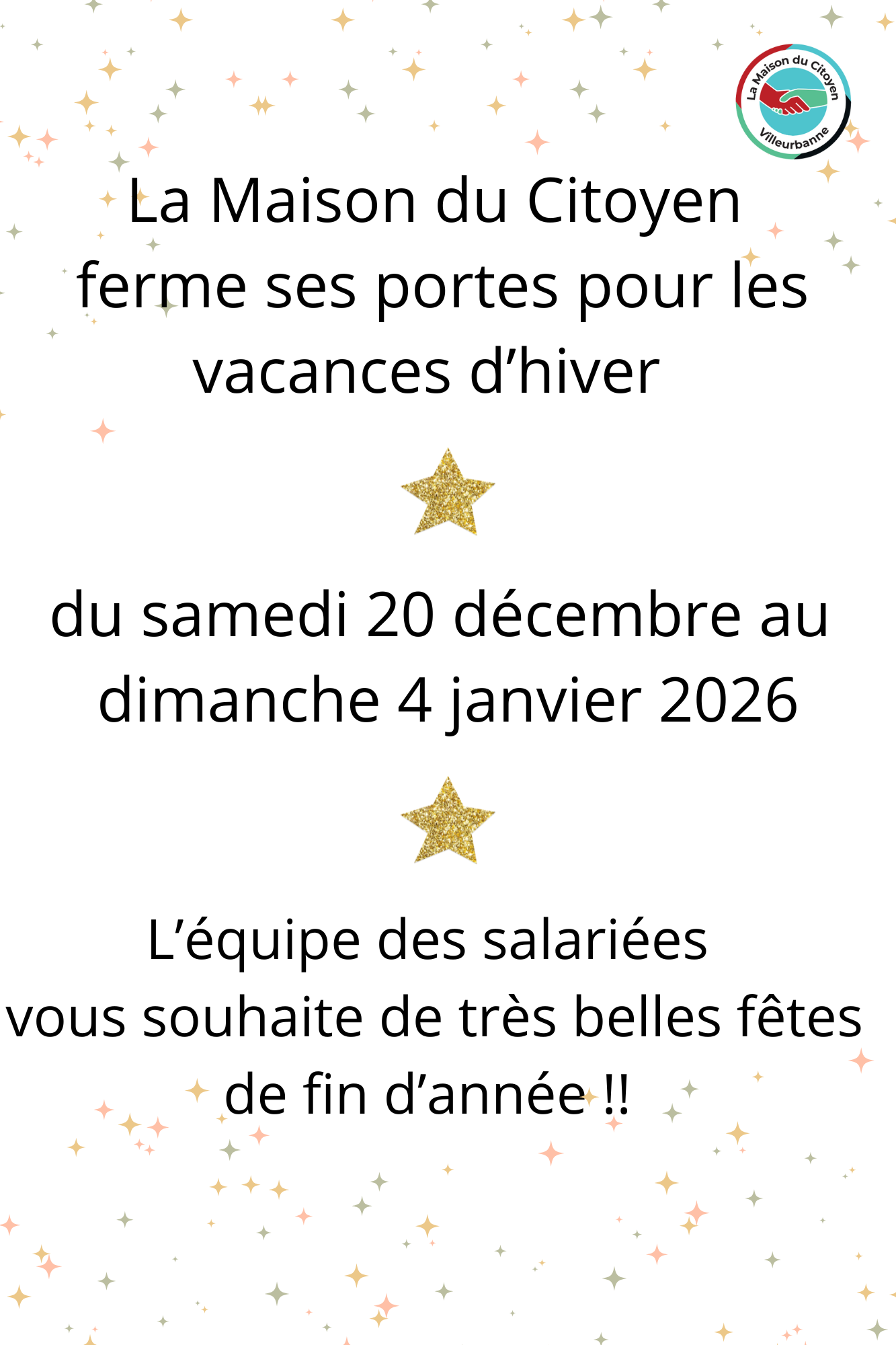 - Lundi 22 Décembre 2025 au Vendredi 3 Janvier 2026 inclus : Fermeture de la Maison du Citoyen (Vacances d’hiver)